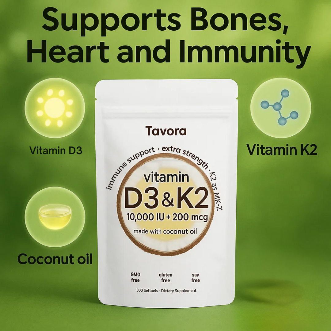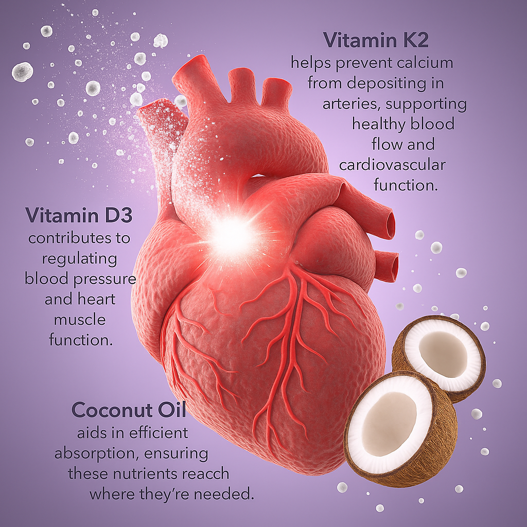 It supports strong bones, a healthy heart, and a balanced immune system. Vitamin D3 helps your body absorb calcium, Vitamin K2 directs calcium to your bones and teeth, and coconut oil improves absorption for better results.