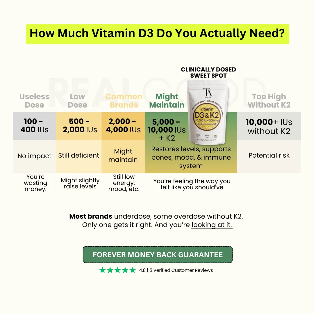 We’re confident you’ll love Tavora Vitamin D3 + K2 with Coconut Oil. But if for any reason you’re not fully satisfied, simply contact us within 30 days of purchase at tarovacustomerservice@gmail.com for a full refund — no questions asked. Your health and satisfaction are our top priority.