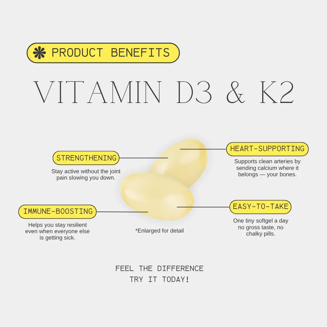 D3 helps your body absorb calcium, while K2 ensures calcium goes to your bones and teeth — not your arteries. They work best as a pair.